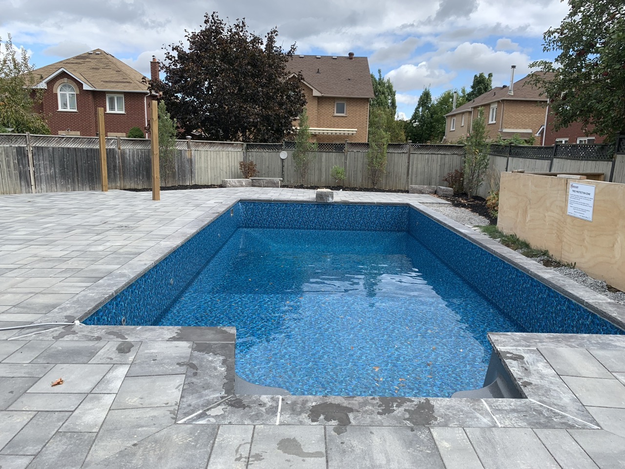 The pool interior is finished with a vinyl liner. This step not only enhances the pool's appearance but also protects the structure from damage and deterioration.
